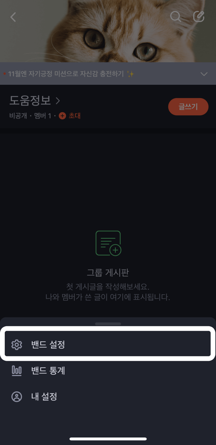 1. 네이버밴드 홈화면에서 자신이 리더나 공동리더로 있는 개별밴드를 클릭하여 들어간다.