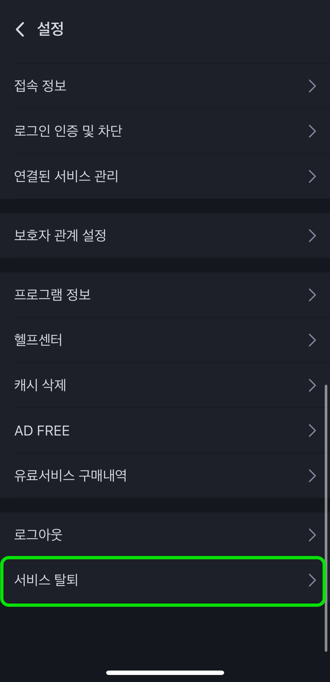 - 설정 내 스크롤을 가장 하단으로 내려서 '서비스 탈퇴'를 클릭한다.