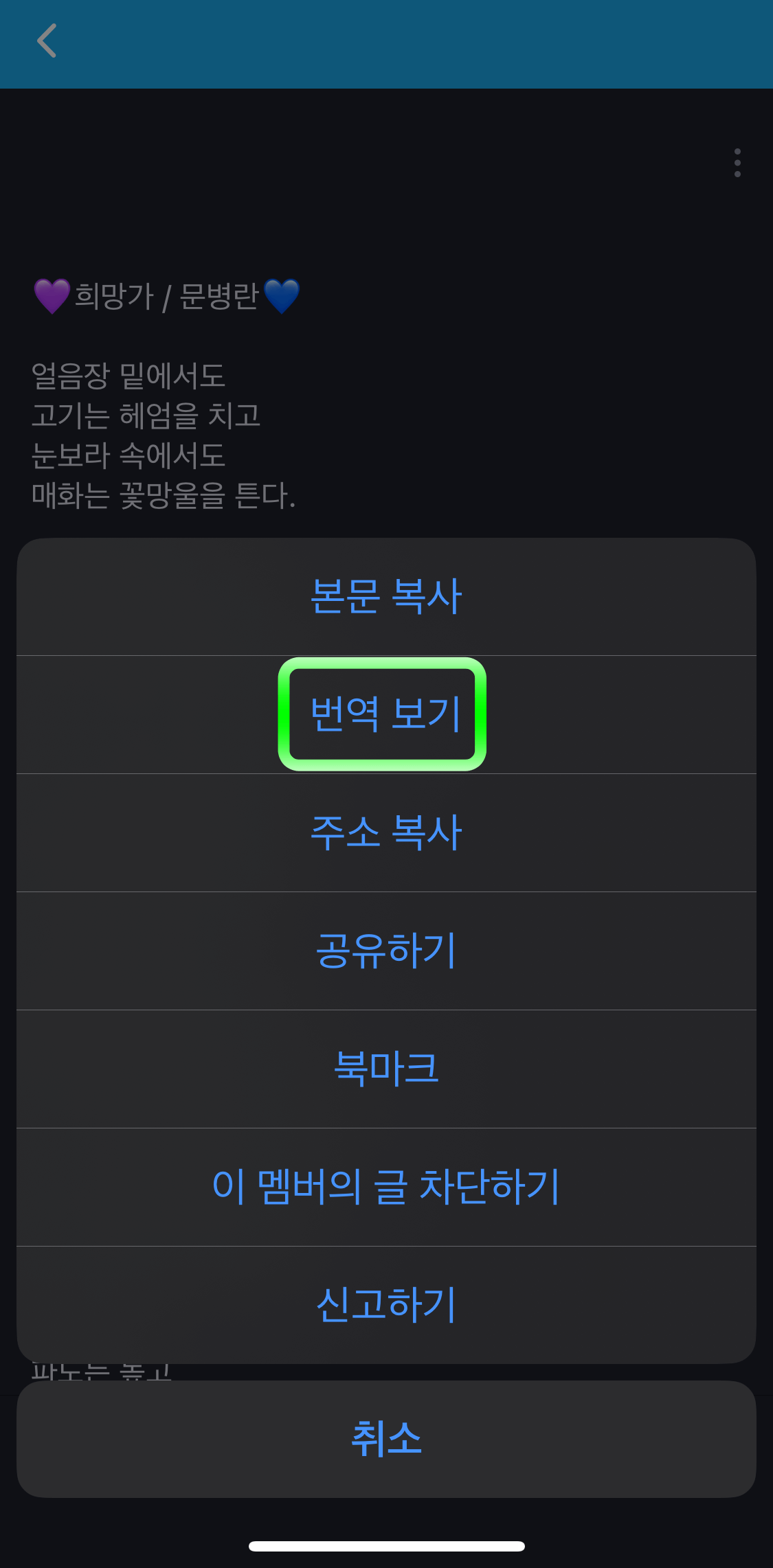 1. 자신이 설정한 번역 언어로 보고자 하는 게시글에 들어간다.