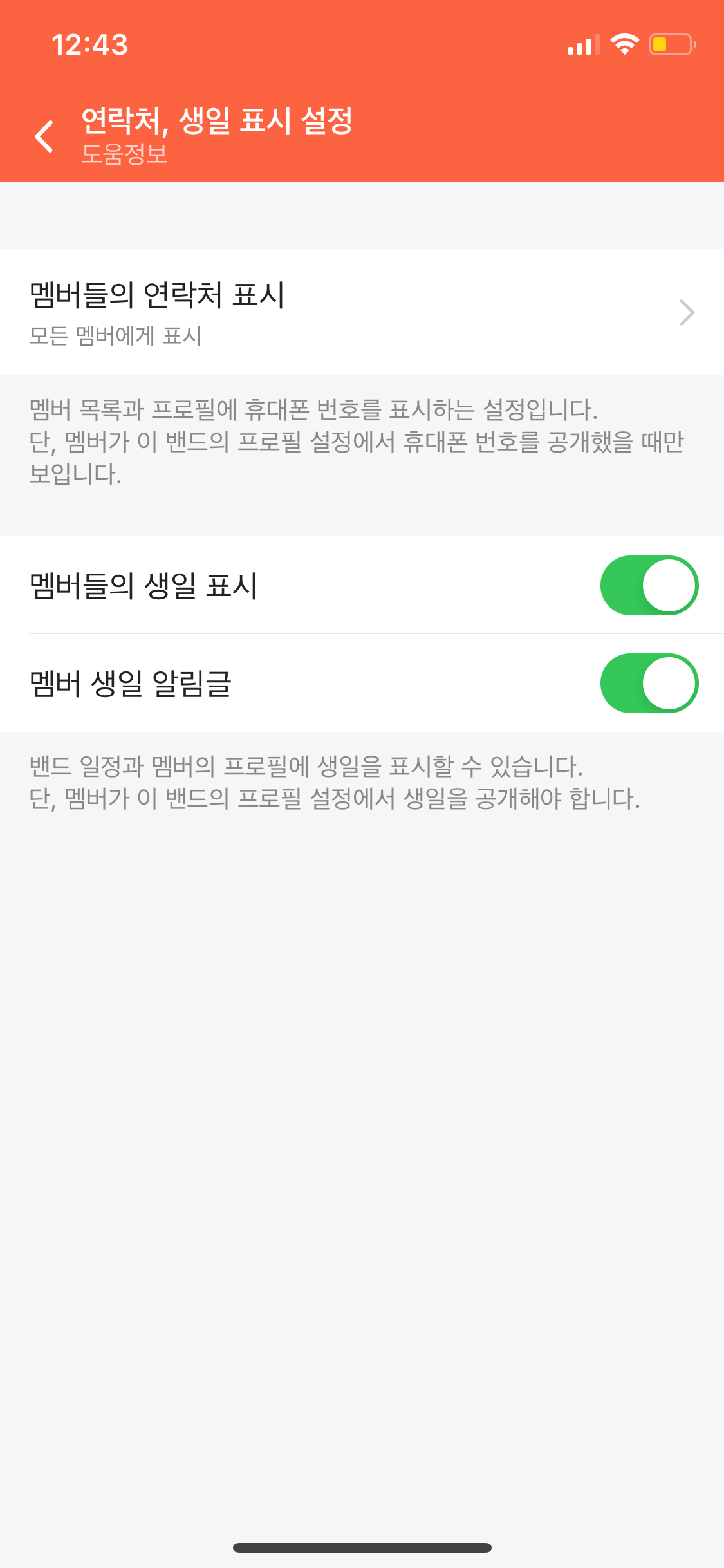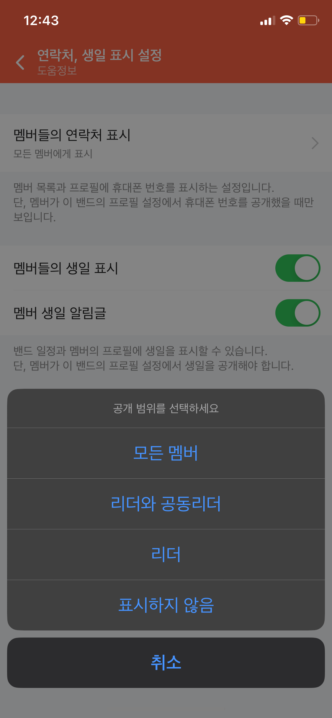 리더가 밴드의 설정을 '멤버들의 연락처 표시'로 했을 경우에도 멤버 개인이 자신의 생일과 연락처 공개 여부를 설정할 수 있습니다. 그 단계는 다음과 같습니다.